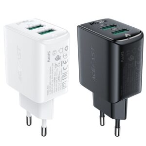 Acefast quick charger with two USB ports. Allows fast charging in Quick Charge 3.0, AFC and FCP standards. Two devices can be connected to it at the same time. It is made of fireproof PC material. It has been equipped with many protections, such as overheating, overvoltage, high voltage or overload.