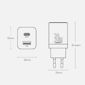 Smart wall charger with European connector and support for numerous fast charging technologies. A compact gadget equipped with 2 ports: USB Type C and USB . Perfect for renewing the energy of mobile devices such as smartphones, tablets or even laptops.