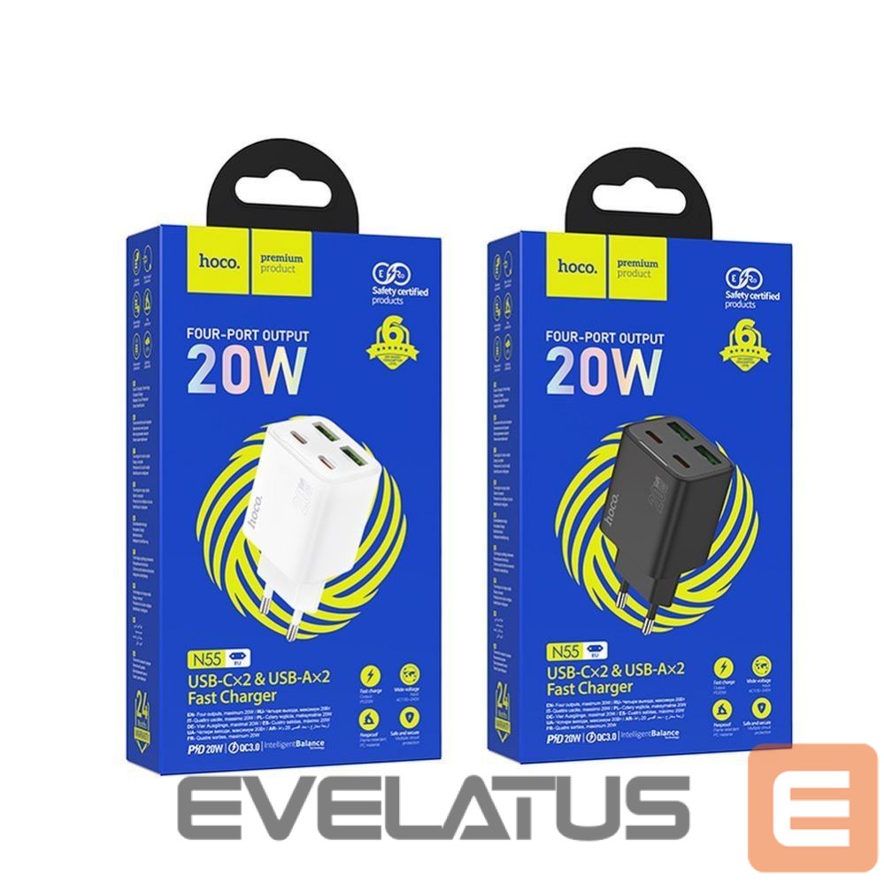 Hoco N55 wall charger with fast charging function and quadruple output. Allows you to quickly charge mobile devices.