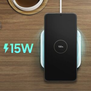 The design of the Samsung Wireless Charger Pad EP-P2400TWEGEU is a combination of elegance and functionality. The slim and compact design makes the charger fit even in limited space. Thanks to this, you can place it wherever it is most convenient for you – on your desk, bedside table or in your car. Now you can charge your devices in style and convenience.