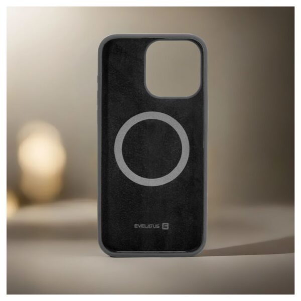 Evelatus Premium MagSafe maciņš ir izgatavots no augstas kvalitātes silikona, kas iegūts no šķidrā silikona (Liquid silicone). Šis process nodrošina izturīgu, elastīgu un patīkamu taustei materiālu ar soft touch pārklājumu. Maciņa iekšpuse ir pārklāta ar smalku mikrošķiedras audumu, kas papildus aizsargā jūsu tālruņa korpusu no skrāpējumiem. Iebūvētais magnēts ir nemanāmi integrēts maciņa dizainā, nodrošinot ātru un ērtu MagSafe aksesuāru piestiprināšanu. Ergonomiskais dizains nodrošina ērtu un drošu tālruņa lietošanu, bet soft touch pārklājums piešķir papildu komfortu.