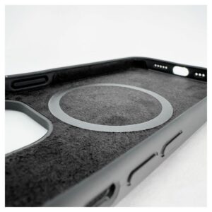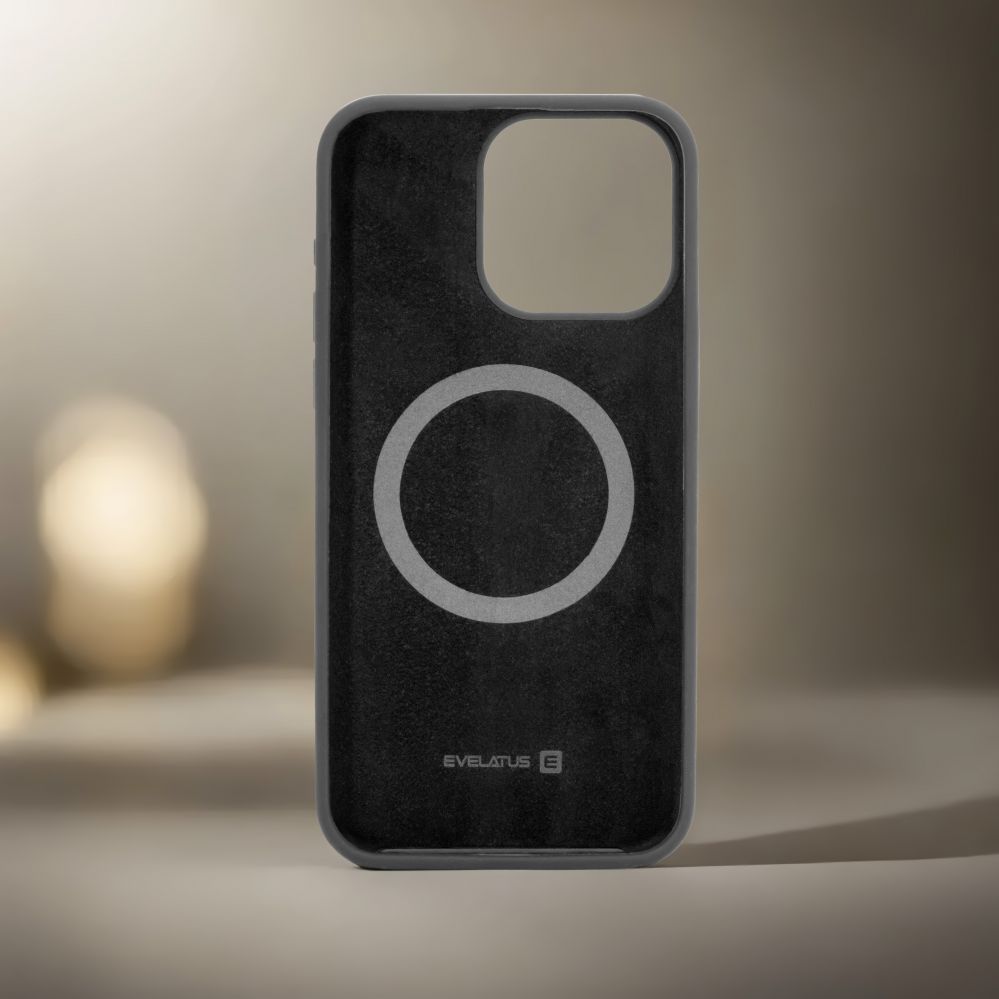 Evelatus Premium MagSafe maciņš ir izgatavots no augstas kvalitātes silikona, kas iegūts no šķidrā silikona (Liquid silicone). Šis process nodrošina izturīgu, elastīgu un patīkamu taustei materiālu ar soft touch pārklājumu. Maciņa iekšpuse ir pārklāta ar smalku mikrošķiedras audumu, kas papildus aizsargā jūsu tālruņa korpusu no skrāpējumiem. Iebūvētais magnēts ir nemanāmi integrēts maciņa dizainā, nodrošinot ātru un ērtu MagSafe aksesuāru piestiprināšanu. Ergonomiskais dizains nodrošina ērtu un drošu tālruņa lietošanu, bet soft touch pārklājums piešķir papildu komfortu.