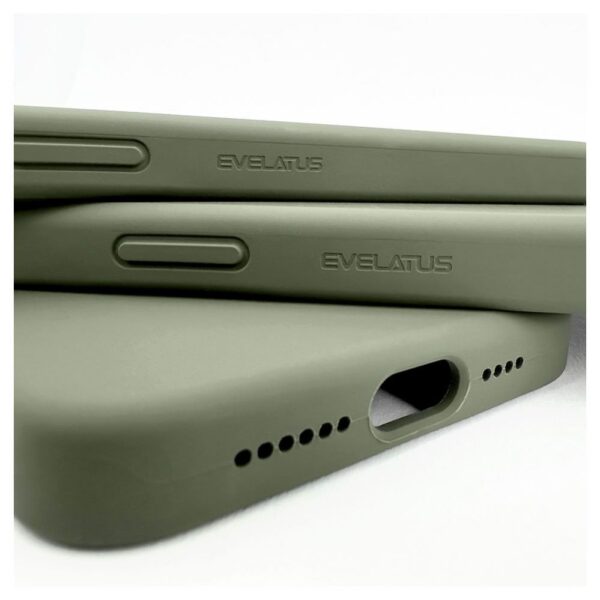 Evelatus Premium MagSafe maciņš ir izgatavots no augstas kvalitātes silikona, kas iegūts no šķidrā silikona (Liquid silicone). Šis process nodrošina izturīgu, elastīgu un patīkamu taustei materiālu ar soft touch pārklājumu. Maciņa iekšpuse ir pārklāta ar smalku mikrošķiedras audumu, kas papildus aizsargā jūsu tālruņa korpusu no skrāpējumiem. Iebūvētais magnēts ir nemanāmi integrēts maciņa dizainā, nodrošinot ātru un ērtu MagSafe aksesuāru piestiprināšanu. Ergonomiskais dizains nodrošina ērtu un drošu tālruņa lietošanu, bet soft touch pārklājums piešķir papildu komfortu.