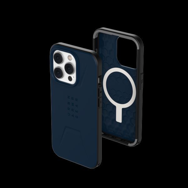 UAG Civilian THE STRONGEST OF THE STRONGEST HYPERCRUSH Civilian belongs to the group of the most powerful series of the UAG brand. This is a series of housings distinguished by the special HyperCuch feature. HyperCrush is an effect obtained by combining TPU with polycarbonate. A hexagon pattern was formed on the surface of both materials. The resulting structure creates an armored exoskeleton that dissipates the energy generated when the phone collides with the surface. 100% resistant to the effects of iPhone falls from a height of up to 6 m! compatible with wireless charging and MagSafe PORTS AND BUTTONS The buttons and mute switch on the phone are protected against dust by precisely designed, movable housing elements that ensure comfortable use of the phone's functions. CERTIFIED PROTECTION Compliance with the MIL STD 810G 516.6 military standard, specifying the degree of shock resistance in the event of a fall.