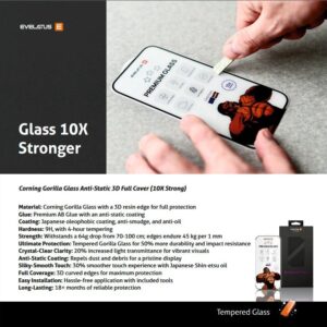 Šis aizsargstikls ir izgatavots no augstas kvalitātes USA Corning Gorilla Glass, kas ir pazīstams ar savu izturību un caurspīdīgumu. Antistatiskais pārklājums novērš putekļu iekļūšanu zem stikla, savukārt 3D Full Cover dizains nodrošina pilnu ekrāna aizsardzību. Augstākās klases AF elektropārklājums ar Japānas Shin-etsu eļļu garantē gludu un jutīgu pieskārienu, kā arī efektīvu aizsardzību pret pirkstu nospiedumiem. Komplektā iekļautais uzstādīšanas komplekts padara stikla uzlikšanu vienkāršu un ērtu.