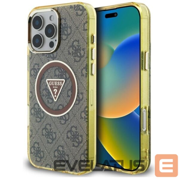 Citas preces Guess Guess IML Metal Glitter 4G Circle Triangle MagSafe Case for iPhone 16 Pro – Brown