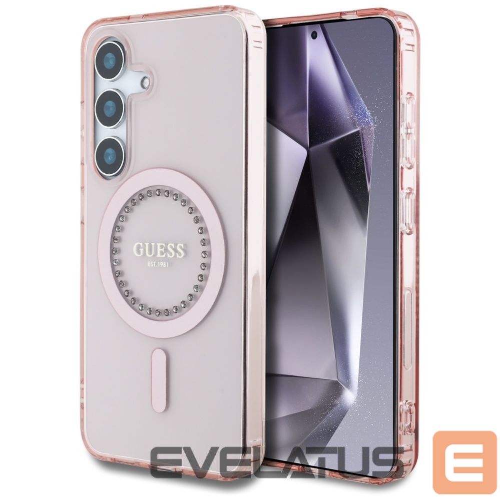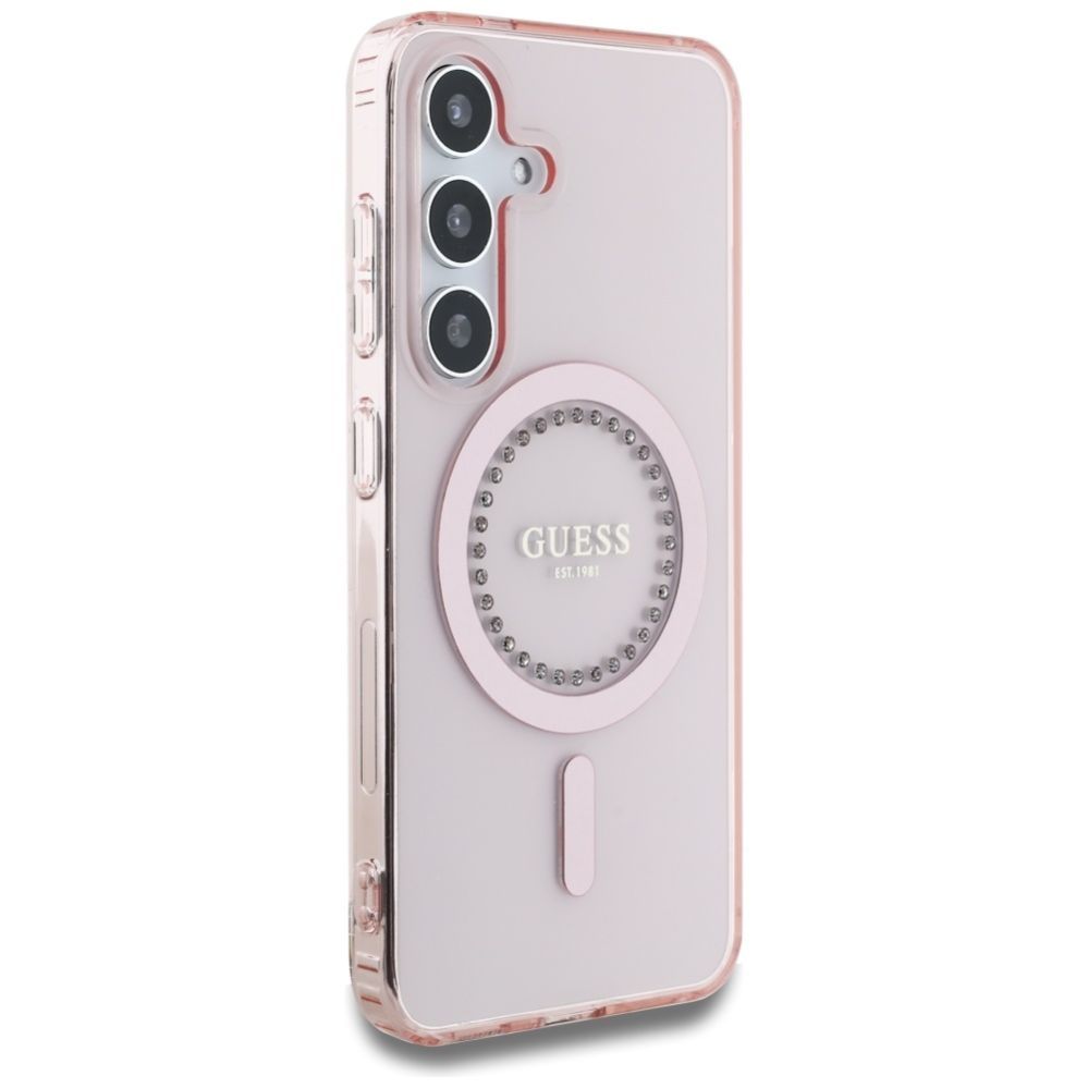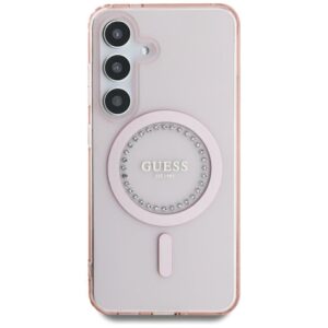 Citas preces Guess Guess Rhinestones Printed Classic Logo MagSafe Samsung Galaxy S25 Case Pink