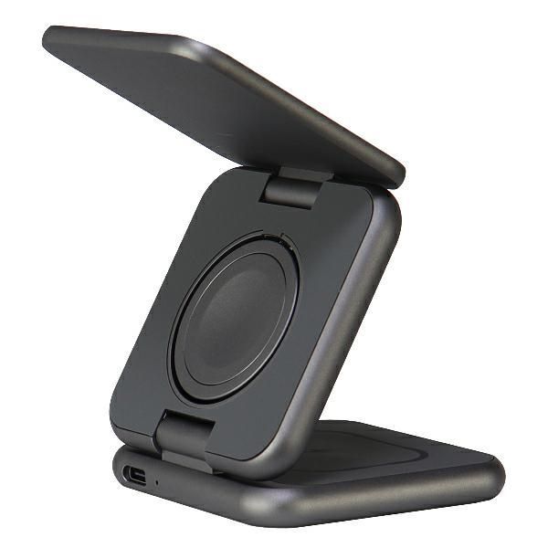 Thanks to this charger, you can charge three devices at the same time, and its foldable, compact housing allows you to take the charger anywhere. The small size allows you to put it in your hand luggage or in your clothes pocket. When unfolded, the charger also serves as a base for the phone, enabling convenient and stable mounting of the phone in a vertical position.