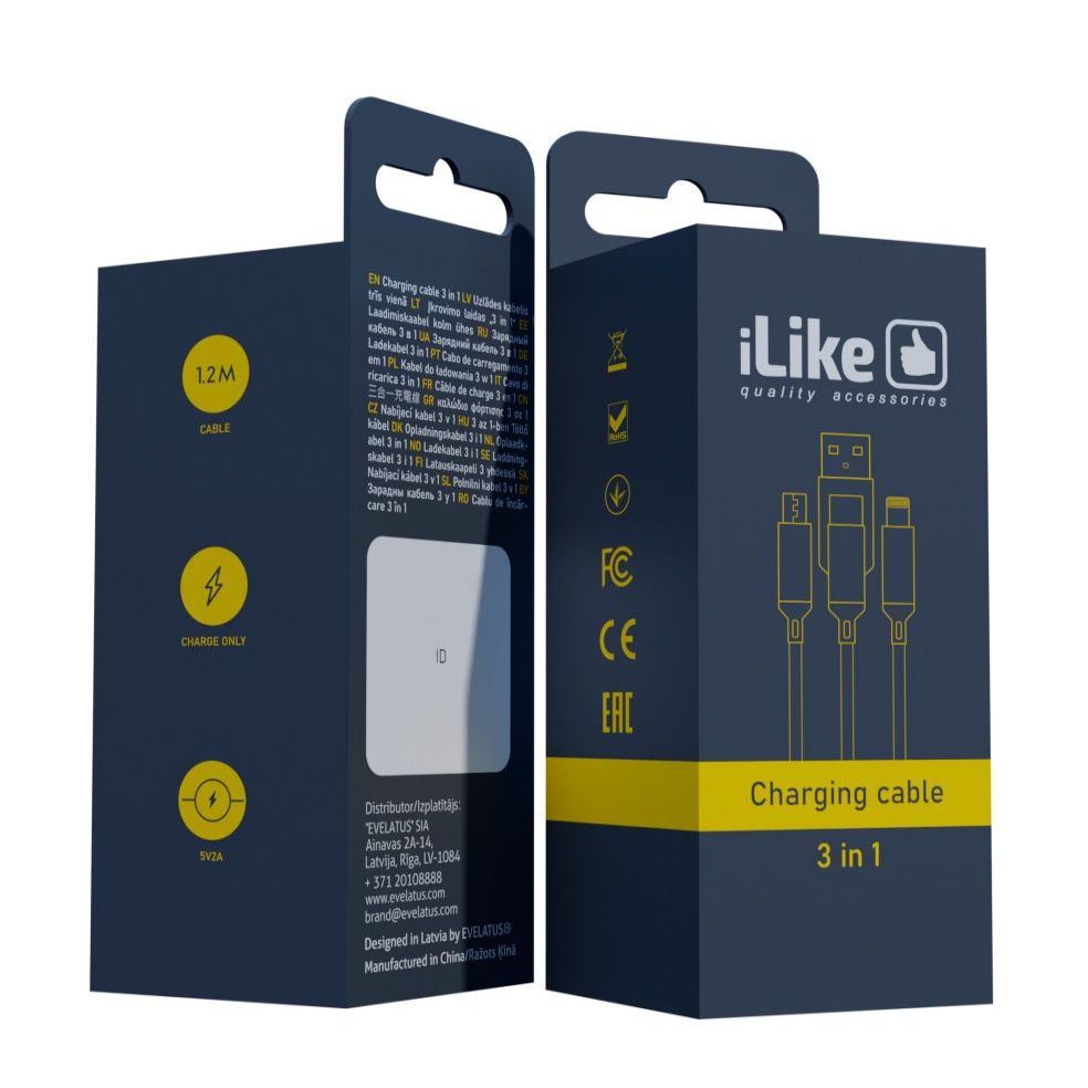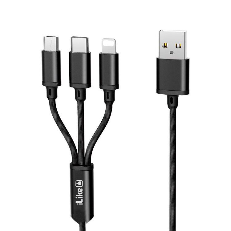 Kabelis iLike Charging Cable 3 in 1, USB, Type C, Lightning, CCI02 Black
