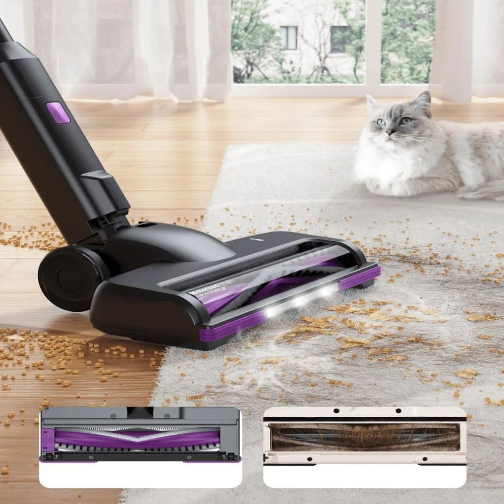- Efektīva tīrīšana tumsā un bez matu murskuļiem: LED apgaismojums uz grīdas uzgaļa izgaismo tumšos stūrus, savukārt pretaptīšanās tehnoloģija samazina rūpes par matu tīrīšanu no birstes.