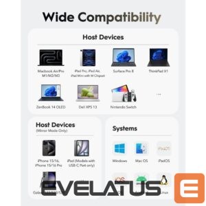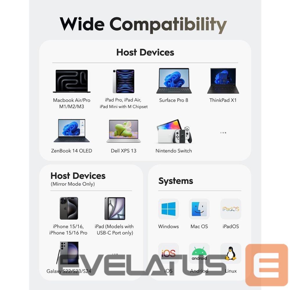 Darbojas lieliski ar Windows, macOS, iPadOS, Android, ChromeOS un citām USB-C ierīcēm, kas atbalsta DisplayPort Alt Mode.